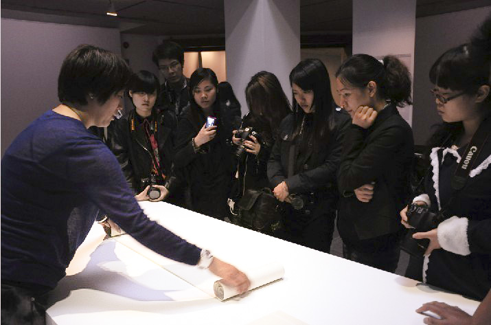 此次活动由广东美术馆和我院艺术设计系共同举办,是一次美术馆艺术品鉴赏活动和高校艺术教学合作的有益尝试。与以往的展览形式不同,此次展出的作品仅有手卷与册页,且全都存放于画案上的画匣中。参观者可如古代画家文人那样,亲手轻启卷画,与艺术家共同品茗清谈雅趣。