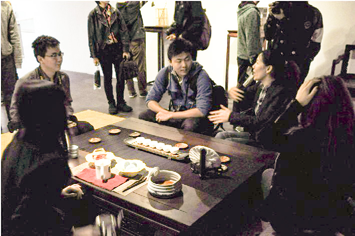 在美术馆讲解员的带领下,先进入雅室品茶,在了解中国传统茶文化的同时,还原了古人赏画的原始语境,使学生静下心,摆脱烦嚣城市生活的杂念,然后开始赏画过程。当进入空阔的展厅,卷轴缓缓铺开,艺术家与学生细语交流时,一场艺术家与学生的对话、公共艺术机构与高校教学的交融之旅就此展开。