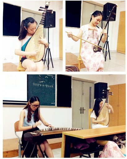 随后便是“跨界表演团队”的同学们为大家所带来的展示和赏析。柔情与热烈相结合的古筝琵琶二重奏《彝族舞曲》让现场一片安静,同学们似乎是屏住了呼吸,静静地欣赏着来自少数民族的美妙音调。