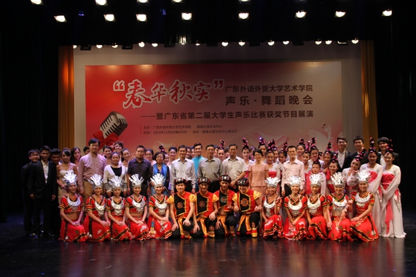 11月8日,艺术学院在顺德北滘文化艺术中心音乐厅举办了题为“春华秋实”——广东外语外贸大学艺术学院声乐•舞蹈晚会暨实践教学基地、党团共建基地揭牌仪式。北滘镇党委副书记余卓焜、教育局局长陈宇莹,文化艺术中心主任何志江,我校副校长方凡泉,艺术学院院长李于昆、党总支书记朱珍葶、副院长罗金燕、副书记林烈群、各系部主任以及参加当晚演出的七十多位学生参加了此次活动。