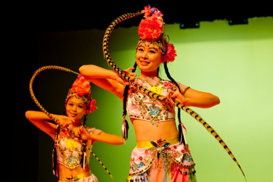“咚——咚咚咚——咚咚咚”伴随着国粹京剧的擂鼓声,14位俏花旦甩着长长的翎子登上舞台,拉开了本场演出的序幕。花旦们穿着华丽的服饰妆容,加上从京剧唱念做打的改编来的身段动作,更是大气典雅。每一个转身和甩头,一颦一笑,都赢得了美国友人的惊叹与掌声。来自博尔州立大学的舞者Alex还说:“This is the most amazing dance I’ve ever seen”。