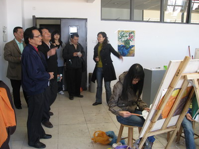 三一一大学代表团在访问大学期间,于29日早上前来艺术学院参观交流。艺术学院党支部书记车小真陪同参观并向客人详细介绍了学院的情况。