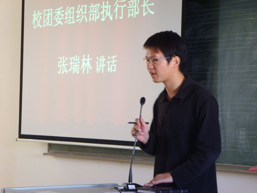接着,校团委组织部执行部长张瑞林同学也为我们发表讲话。他以流利的语言,有条理地给到场的干部干事讲述了他个人对学生干部所应具备的素质的看法。他以“责任,态度,合作,热忱,激情,技巧,礼仪,分享,人际关系”这九个词语来概括学生干部所应该具备的素质。同时,他还将团学各阶层比喻成身体的各个部分,形象地揭示了团学各部门、各阶层的位置和工作职能。最后,张瑞林师兄还给我们就如何兼顾好学习与工作提出了几点有效的建议,并以“我们重质不重量,我们虽然是小学院,但我们并不比大学院差”这出自心底的话鼓舞我们。