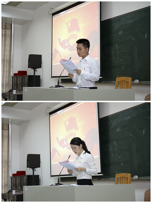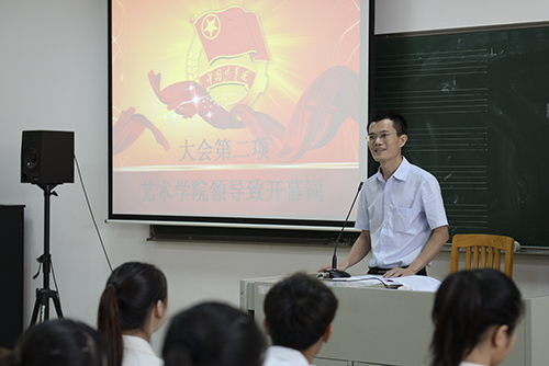 在庄严的国歌声中,大会正式拉开序幕,学院党总支副书记上台致辞。他首先代表学院感谢过去一年团委学生会各位干部的辛勤付出,正因为大家的共同努力,学院团委才在2013-2014年度五四表彰中获得“社会实践”单项奖称号。他希望新一届委员能团结协作,服务同学的同时不断提升自己,为艺术学院团学工作取得更大的进步再接再厉。