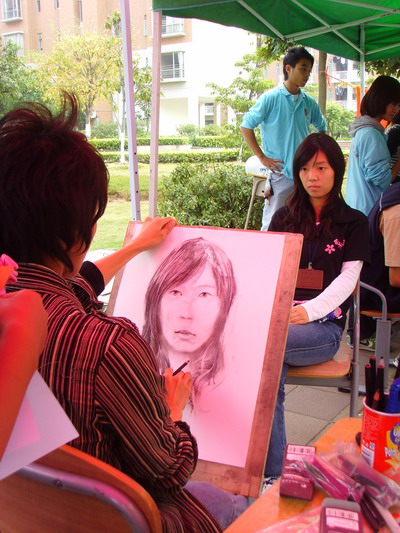 与去年一样,我院的“人物头像素描”成为了全“街”焦点。但这次同学们的作画方式有一些创新,除了传统的纯素描方式,我们还加入了卡通版人物肖像画的形式,得到许多同学的青睐。