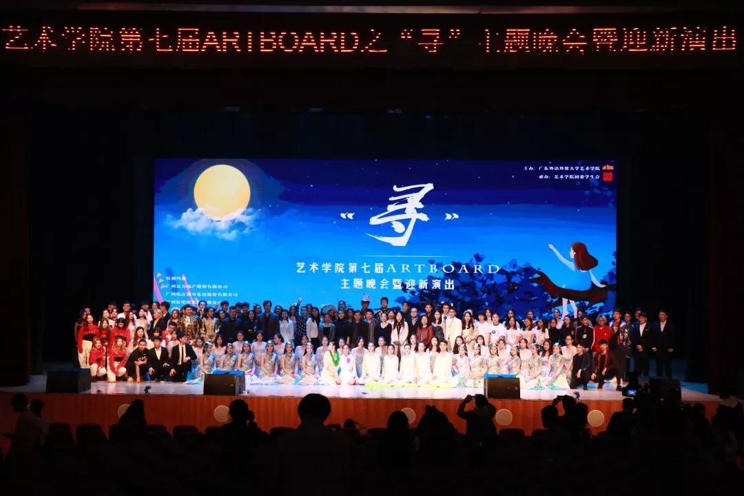 2018年12月20日19时,艺术学院第七届Artboard之“寻”主题晚会暨迎新演出在南校区大会堂拉开序幕。广州富力地产股份有限公司李悦珊、广东金融学院国际教育学院外国留学生办公室主任、MEGA工作室联合创始人董越、商学院副院长徐艺青、信息科学与技术学院/网络空间安全学院党委副书记肖锋、艺术学院全体领导班子、各系部主任、各学院团委书记、专业教师、辅导员、广州美术学院、广东工业大学、广州大学学生,以及广外的同学们出席参加本次演出。
