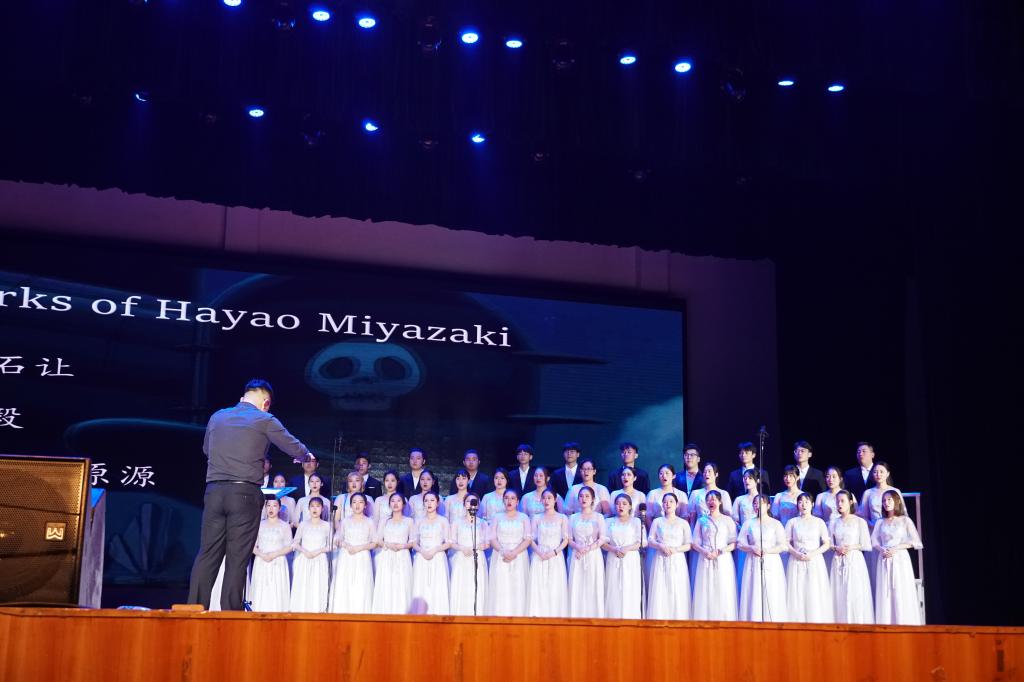 蓝色舞台灯下,18级音乐表演合唱团用歌曲《天空之城》,伴随着宫崎骏动漫的动人场面,美妙的和声慢慢把大家带入艺术鉴赏的佳境。