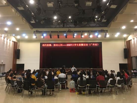 5月27日晚,由我校心理健康教育与咨询中心指导,我院承办的相约鼓圈,鼓动心间——M&R大学生鼓圈活动(广外站)在南校区学生活动中心顺利举行。出席本次活动的有经济贸易学院党委副书记陈静,信息科学与技术学院/网络空间安全学院党委副书记肖锋,我院党总支副书记张莉,心理健康教育与咨询中心主任阎茹。经贸学院、信息学院、艺术学院近一百名师生参加了本次活动。