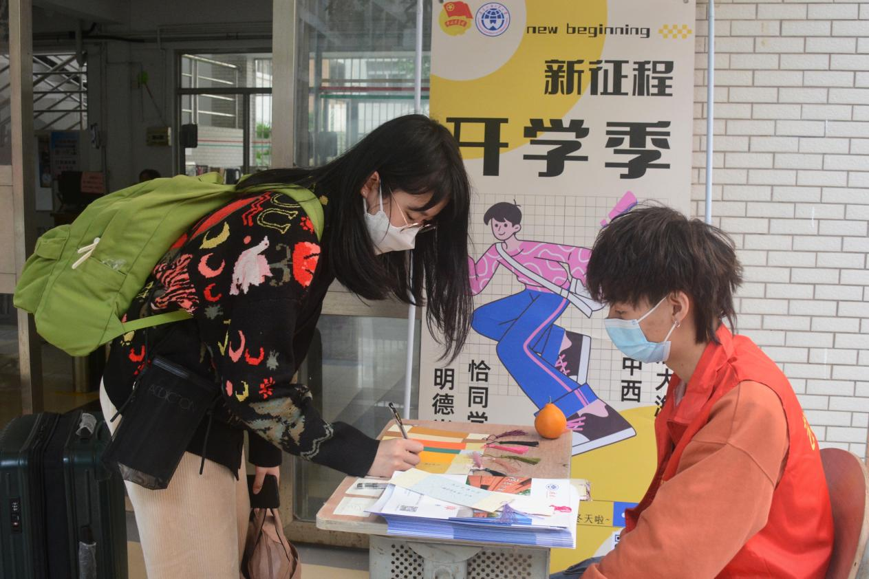 同学们在接待点“打卡”、写下新学期寄语