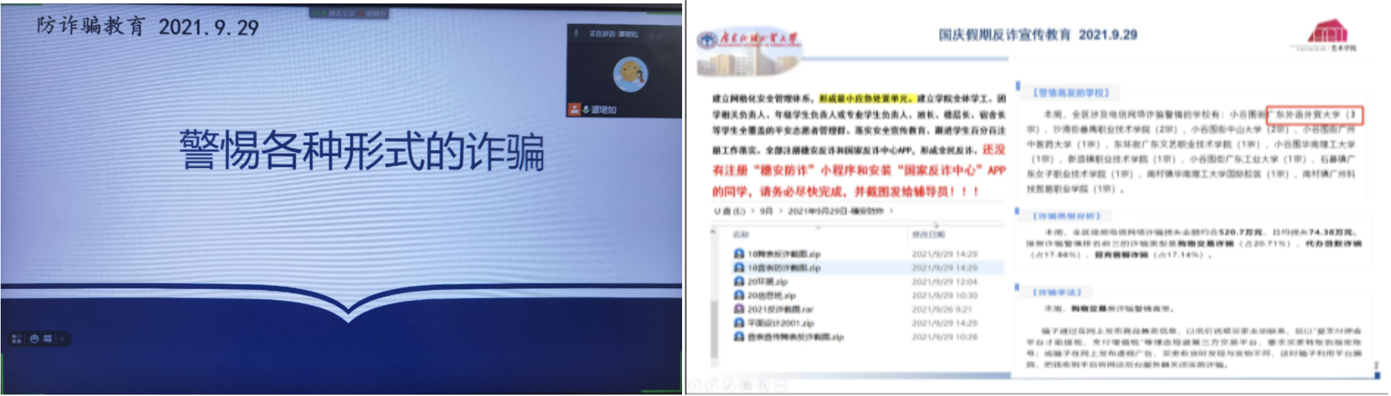 在安全教育方面,谭珺如、林锦松提醒学生警惕多种形式的电信网络诈骗手段,及时留意反诈app发布的信息,增强反诈意识。此外,在国庆假期期间,学生还需注意人身安全和财产安全。