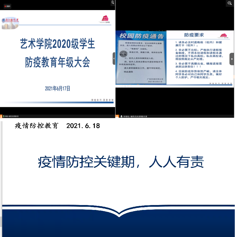 根据当前防疫实际,辅导员提醒同学们绷紧防疫这根弦,严守政府和学校相关规定,非必要不出校,非必要不离穗出省,严格执行请假报备制度;按时进行晨晚检和健康打卡,如有身体不适需立即告知辅导员、及时就诊;督促全体学生务必对自己和身边同学负责,做好个人防护;要求同学们参加全员核酸检测,“应检尽检、不漏一人”,及时接种疫苗,为共筑免疫屏障出一份力。