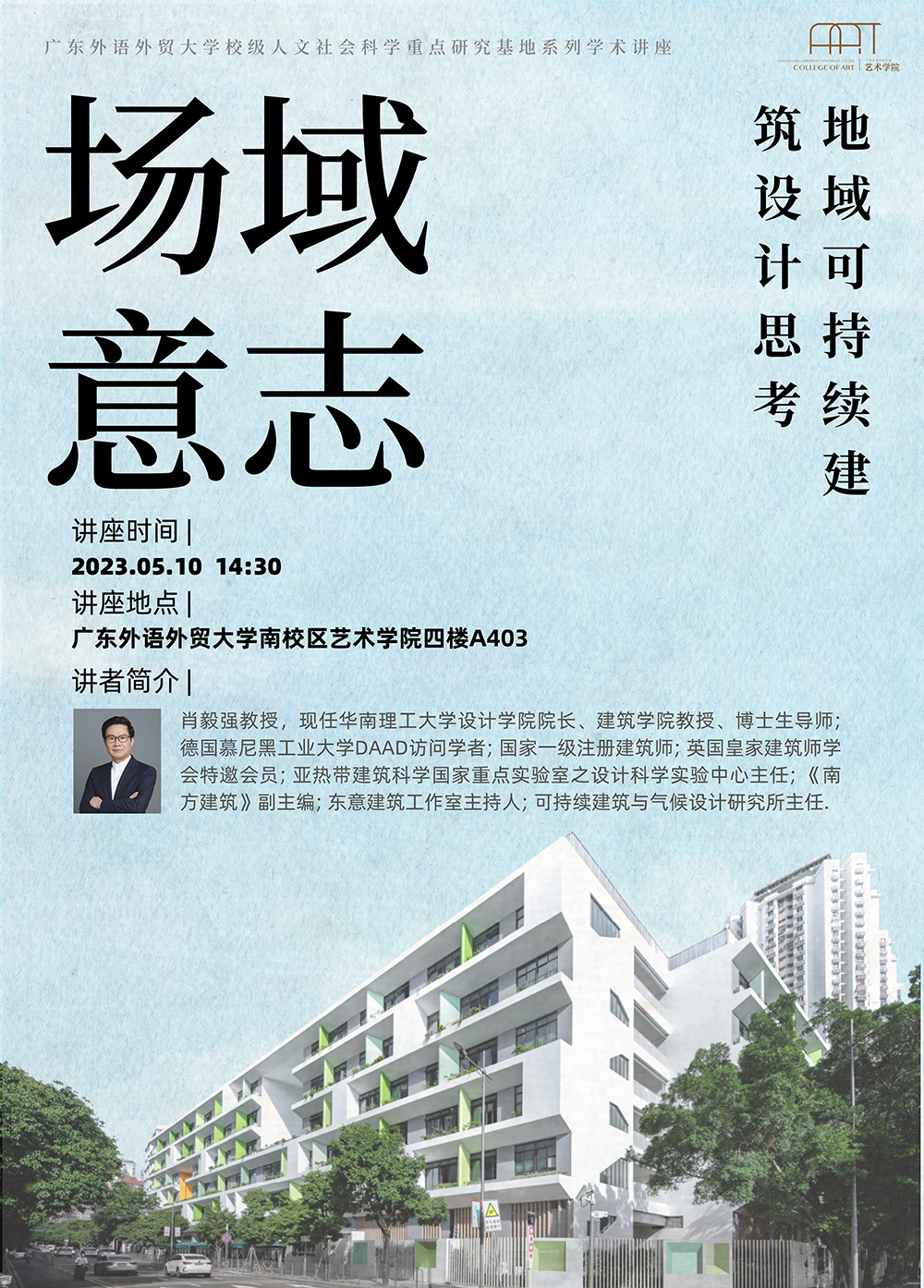为开拓学生学术视野,了解最新研究成果,广东外语外贸大学艺术学院校级重点人文社科基地特邀华南理工大学设计学院院长、博士生导师肖毅强教授前来艺术学院进行讲座,讲座题目为《场域意志——地域可持续建筑设计思考》,欢迎各位老师学生积极参与。
