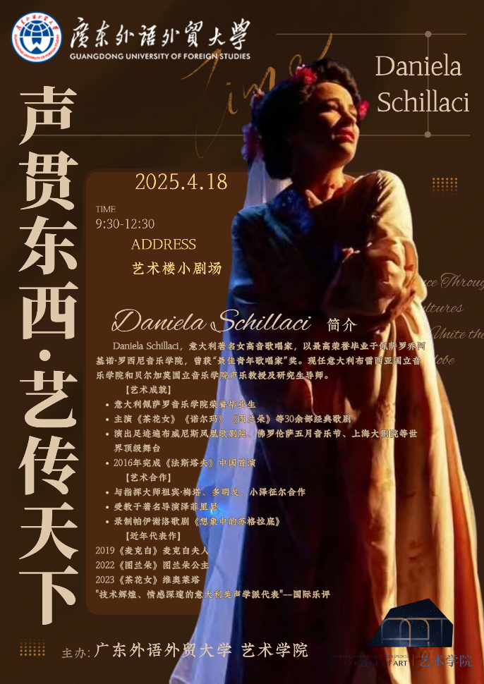 丹妮拉·斯基拉奇(Daniela Schillaci),意大利著名女高音歌唱家,以最高荣誉毕业于佩萨罗乔阿基诺·罗西尼音乐学院,曾获“最佳青年歌唱家”奖。现任意大利布雷西亚国立音乐学院和贝尔加莫国立音乐学院声乐教授及研究生导师。她的职业生涯遍布全球顶级歌剧院,包括威尼斯、罗马、佛罗伦萨、首尔、上海等,饰演过《茶花女》中的维奥莱塔、《诺尔玛》中的诺尔玛、《图兰朵》中的公主等经典角色,并与祖宾·梅塔、普拉西多·多明戈等指挥大师合作。