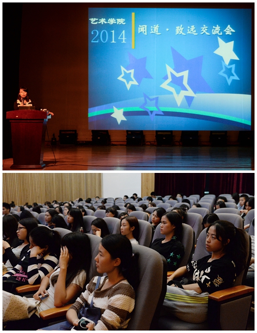 为了使我院2014级新生更好地适应大学生活,尽快掌握大学学习方法,做好大学生涯规划,11月5日晚7:00,我院在艺术楼小剧场举行2014年“闻道·致远”交流会。校友代表2010级艺术管理专业黎倩芬,2011级艺术设计专业吴佳豫、黄培慧,2011级音乐表演专业黄倩婷以及2012级艺术管理专业王尹贝妮等5位同学受邀到现场与2014级新生交流互动。