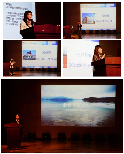 黎倩芬结合自己的大学生涯,勉励大家要尽快找到自己的奋斗目标做好职业生涯规划。吴佳豫分享了自己的学生干部经历和校外实习经历,鼓励大家要积极主动,灵活变通。王尹贝妮结合自己在各种社会实践平台的工作经历,希望大家在大学期间要善于观察和积累,并且学会管理好自己的情绪。黄培慧通过讲解照片,跟大家分享在台湾岭东科技大学交换学习时的学习生活。黄倩婷结合自己从专业平平到专业第一的成长经历,勉励大家要坚持不懈,勇于追梦。