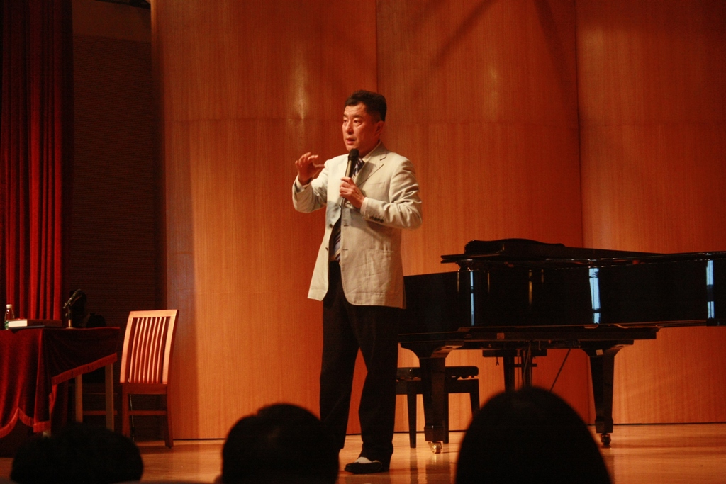 杨岩教授结合他多年形成的教学理论和方法,用风趣幽默的语言,生动形象的例子,为现场所有师生展示了声乐教学及学习中的精妙。他指出,要唱得好首先要有好的钢琴基础。其次,普通话和外语的发音对演唱也至关重要。此外,读词谱也是学习声乐的关键基础。