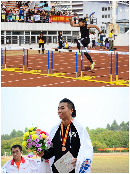 来自12级音表欧阳俊为艺术学院再添佳绩,获得男子100米栏第三名、男子400米第七名。偌大的操场上,他铸就了一道亮丽的风景。