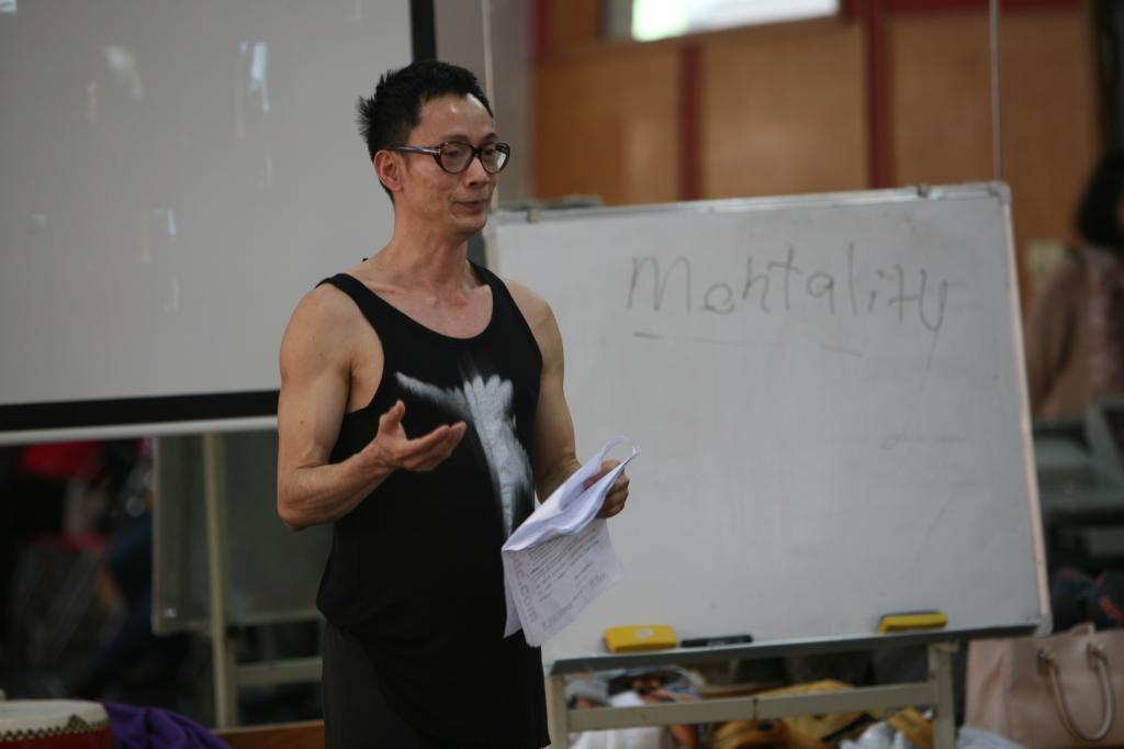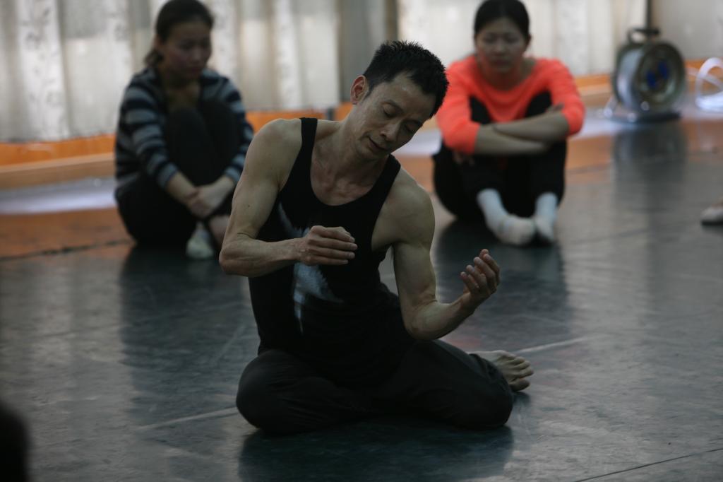 傅兴邦以其独具的舞姿与奇特的创意,对学生们进行了肢体的放松与身体的解放训练,打破了学生们平常对身体运动认识的常规局限性,从而通过引导学生对肢体的解放从而获得思想层面上的升华。他强调了每个人思想层面上的开拓性与自由化,注重能量的激发,主张解放个性与思想,追求独特与创意。在现场对学生进行了专业的指导和艺术启发,并与在场的教师及学生进行了良好的互动。