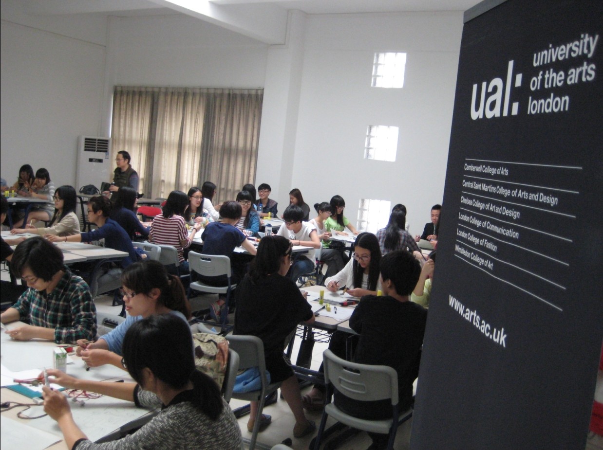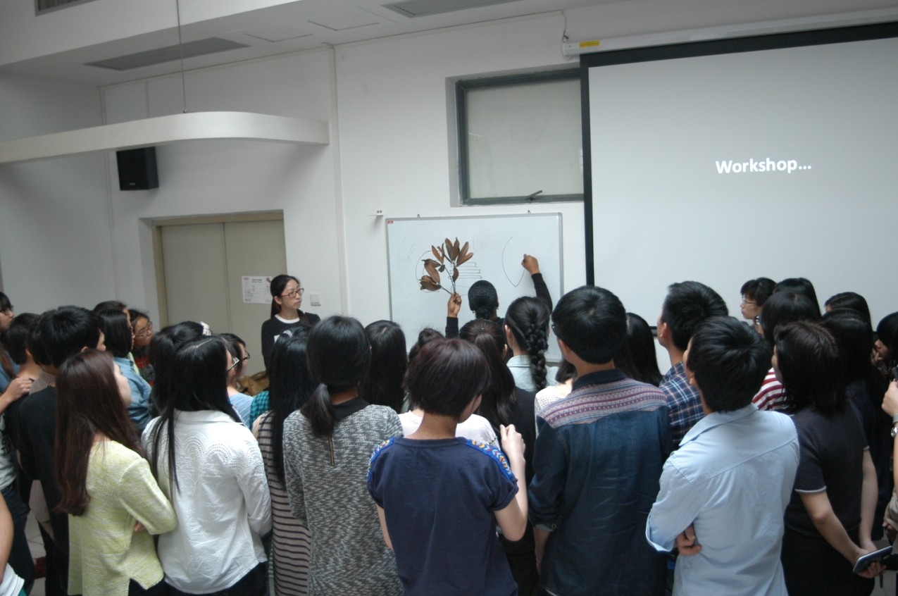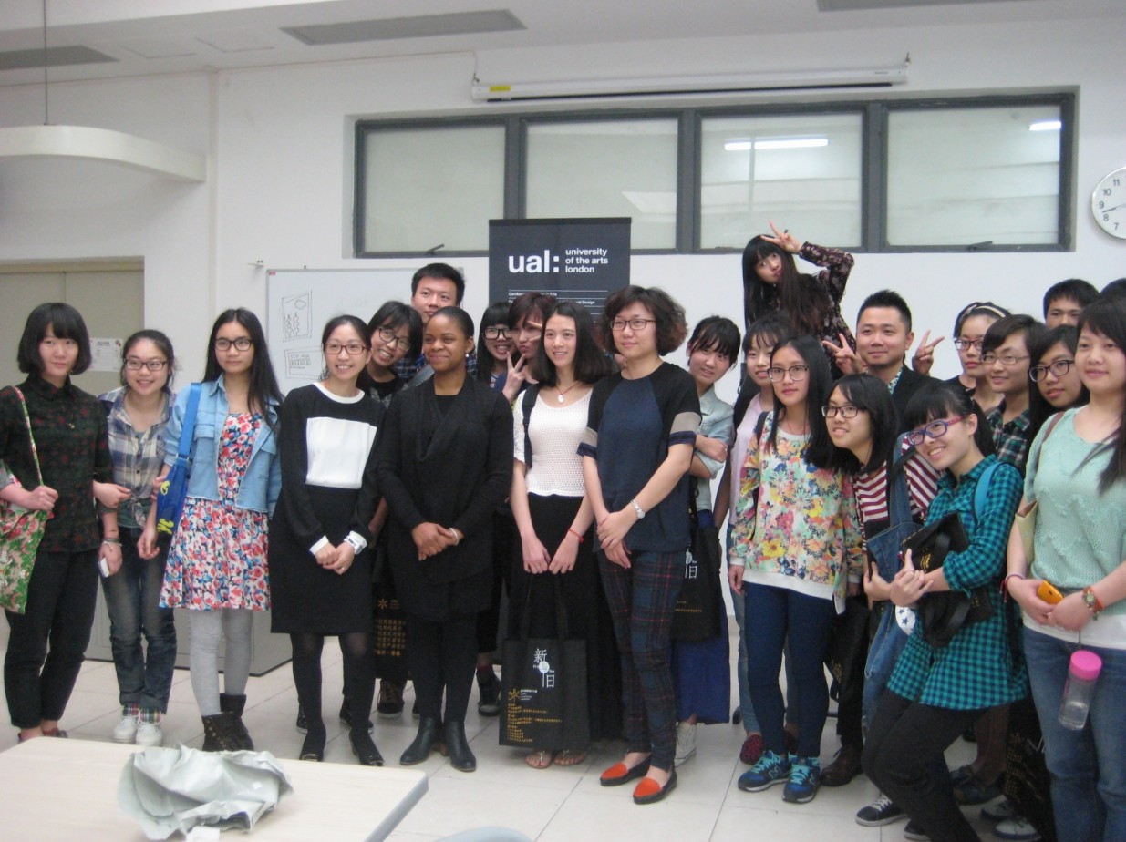 活动一开始Makeba Lewis用简单的中文“你好”就拉近了和同学们的距离,让大家很快融入了课堂。随后她用ppt简单地介绍了伦敦艺术大学包含Camberwell College of Arts等六所学院的课程结构和圣马丁学院学生作品资料,让同学们领略了他们不同学院的教学特色和侧重点。紧接着展示了学生们从预科的简单手稿到以后逐步成为一件作品的过程,从中体现出了英国教师对记录学生想法和创作思路的重视。