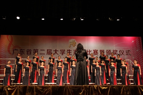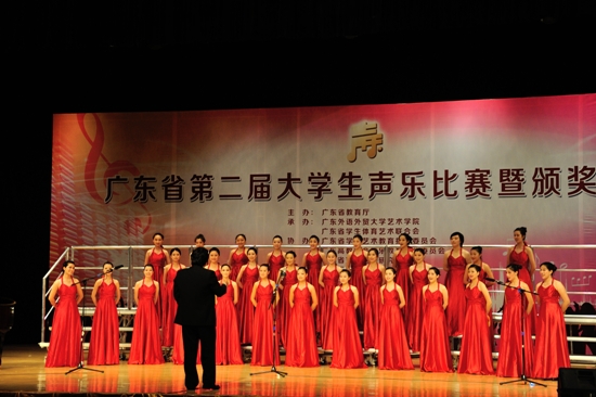由广东省教育厅主办,我校艺术学院承办的“广东省第二届大学生声乐比赛(决赛)暨颁奖仪式”6月2日在我校南校区隆重举行。大赛分为普通组和专业组,演唱形式有独唱、小组唱和合唱。今年1月份正式启动大赛,经过初赛、复赛,共有69个节目入围决赛,分别在大会堂和艺术楼小剧场同时进行。担任本次比赛的合唱组评委的有广东省合唱协会副会长苗向阳、华南师范大学苏严惠、广东外语外贸大学温恒泰教授、华南理工大学米和平、星海音乐学院张新教授,独唱、小组唱组评委的有中国声乐家协会执行主席杨岩、华南师范大学杨天君、国家一级作曲家金旭庚、华南理工大学李茵、广东外语外贸大学罗金燕等人。决赛代表包括来自我校和星海音乐学院、华南师范大学、广东医学院、中山大学、广东工业大学、肇庆学院等省内20余所高校。大赛旨在展示当代大学生的精神风貌和专业艺术表现能力,激发学生们对声乐艺术的热爱和学习。