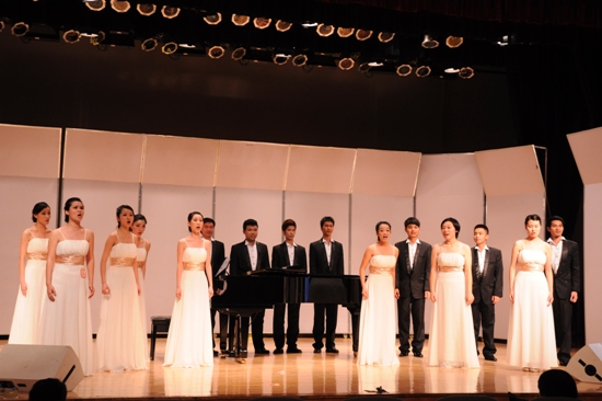 作为本次大赛的东道主,艺术学院选送的参赛队伍表现精彩,无论是独唱、小组唱还是合唱,都以出色的表现赢得了评委的肯定,首次实现了省级大赛的大满贯。张彬教授指挥的广外艺术学院Vivace女声合唱团,此次选择了热情洋溢的中国现代少数民族音乐作品《撒里啰》。三十位身穿火红的长裙姑娘,一出场就给观众以强烈的视觉冲击。不断重复的音型,构建出了多维的空间背景,营造出欢快热闹的节日气氛;随着音乐的进行,优美的旋律缓缓飘出,并渐渐将歌曲推向高潮。值得一提的是,在这首歌曲中,钢琴摆脱了一贯伴奏的形象,模仿了打击乐,配合着大鼓与木槌的声音,新颖独特。观众们仿佛置身于云南少数民族欢乐的节日氛围中。姑娘们惟妙惟肖的表演,让观众们体会到了美即是生活。一曲完毕,台下掌声雷动。