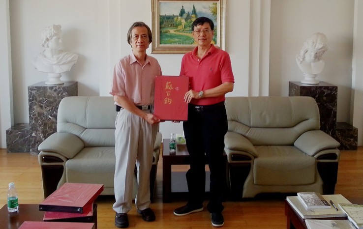 9月17日上午,中央美术学院教授,中国美协中国重彩画会副会长、文化部现代工笔画院副院长苏百钧,应我校图书馆、艺术学院邀请,在南校区图书馆进行了座谈,并捐赠了包括《中国近现代名家苏百钧》在内的百册珍贵画集。我校图书馆副馆长伍方斐、书记麦培年,艺术学院院长李于昆、新闻与艺术实验室主任储晓戈等出席了此次活动。