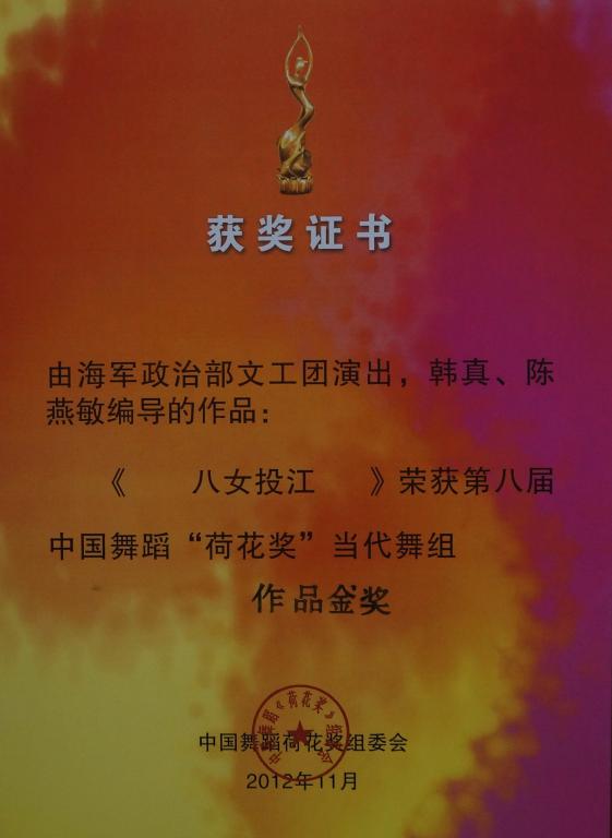 第八届中国舞蹈“荷花奖”现、当代舞奖项于2012年11月28日揭晓,我院陈燕敏老师与海政文工团舞蹈编导韩真共同编导的海军政治部文工团的《八女投江》,以最高分获得本届“荷花奖”四个作品金奖中的一个。