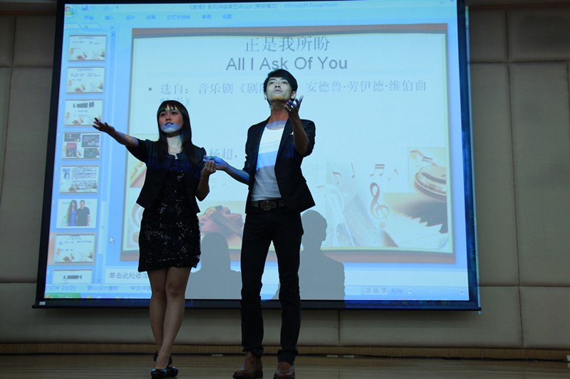 杨健生老师还通过播放演唱世界著名的歌唱家经典作品,如帕瓦罗蒂、弗雷妮等,讲述他们的人生经历和艺术精神。在场的同学倾心听讲,感触颇深,陶醉在歌剧世界里。随后,杨老师讲述了中国歌剧的诞生,并简单介绍中国歌剧三个主要时期的代表作品,如《白毛女》、《江姐》、《原野》等,音乐系同学分别演唱了《江姐》、《红珊瑚》《野火春风斗古城》等歌剧精彩片段,使在场老师初步了解中国歌剧形成和特点,以及现在中国歌剧在世界中的地位,杨老师还简单介绍音乐剧的形式及著名代表作,音乐表演系的同学们表演了《歌剧魅影》片段“All ask of you”把讲座推向高潮。