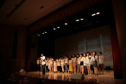 6月27日晚八点,广东外语外贸大学艺术学院2011届毕业晚会“回眸·感恩”在艺术学院小剧场举行。艺术学院党总支部书记袁长青、院长李于昆、副院长罗金燕、党总支副书记林烈群、音乐系主任王蓓、艺术设计系主任储晓戈、公共教学部主任杨健生、辅导员张莉和各专业老师出席了此次晚会。