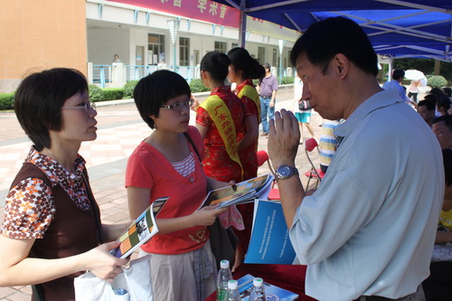 学生志愿者一早就来到摊位进行准备工作,搬运展板布置现场。早上8:30,咨询点工作准备就绪,迎接前来咨询的家长及考生。