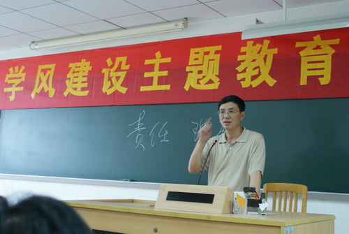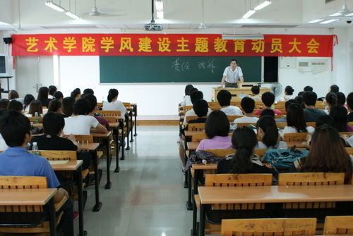 为进一步加强学院的学风建设,营造良好的学习氛围,使学生明确学习目的,端正学习态度,提高学习的主动性和学习效率,我院于6月17日在教学楼E205课室组织开展了学风建设主题教育动员大会。院党总支书记车小真,院长李于昆,音乐系主任王蓓,艺术设计系主任储晓戈以及辅导员张莉和曾继平出席大会,2009级全体学生参加了大会并认真听取了会议内容,大会由车小真主持。