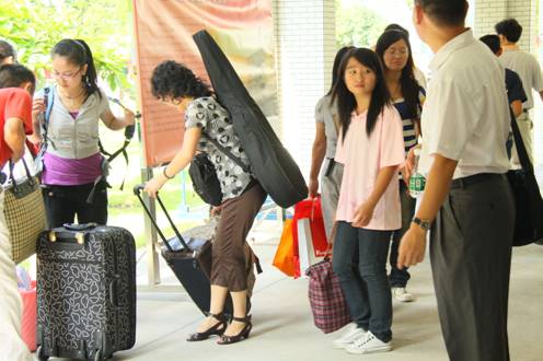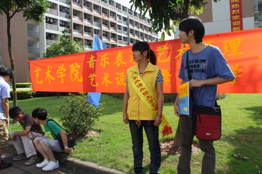 除了负责接待的同学外,还有负责引导和搬运行李的志愿者。他们顶着烈日,在炎热的天气里东奔西走。但是,他们也深刻的意识到,当各位新生和家长首次到达学校时,他们是给人的第一印象是“活招牌”,所以,虽然炎热和辛苦,他们依然带着灿烂的笑容,成为了校园上一道独特亮丽的风景线。