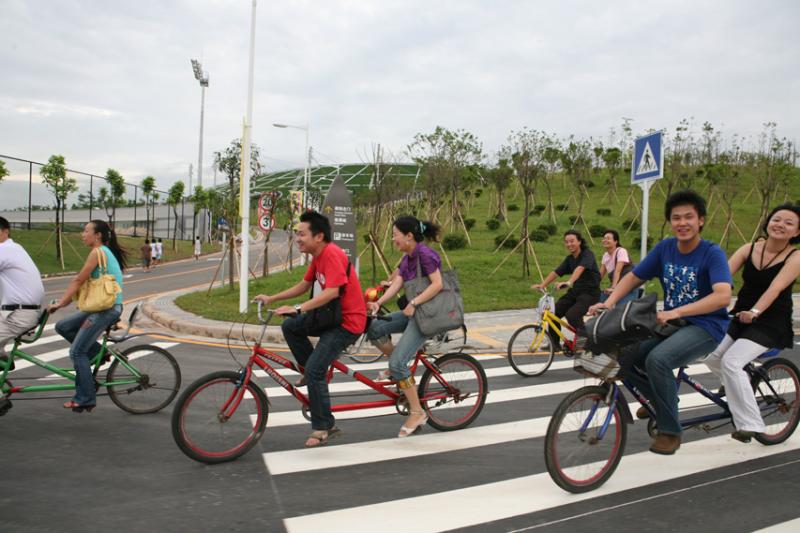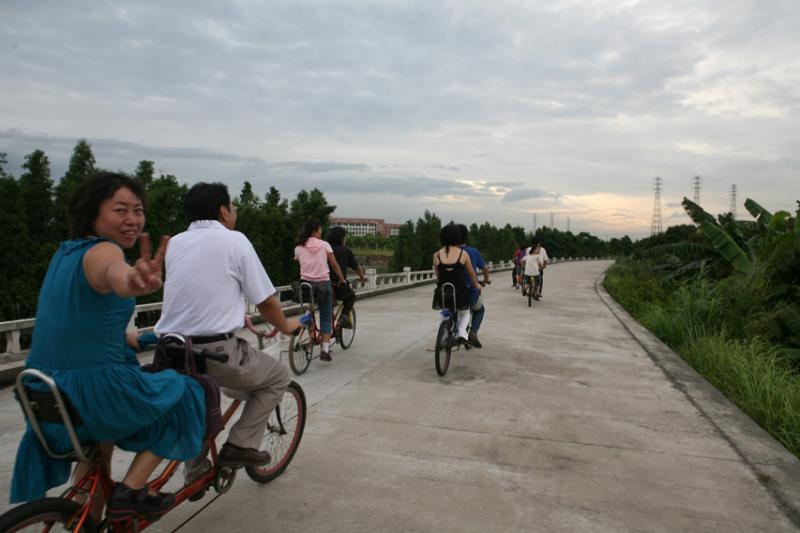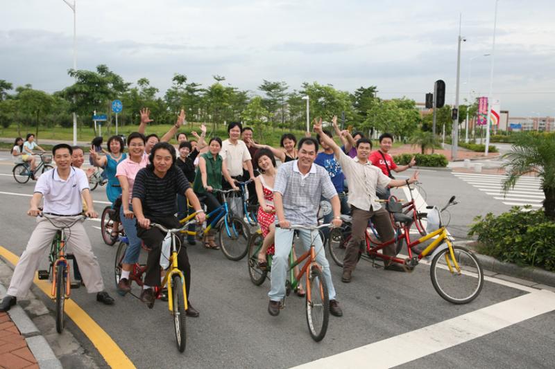 活动中,男女教师各自组合跨骑双人或三人自行车,沿着风光迤逦的大学城外环路行进,途经美丽的中心湖区、幽静的长洲岛等地。队伍时而竞相比快,时而放慢速度作悠闲游。路途中,不少老师还不忘炫一炫艺术学院教师的本色,在行进的车上长袖善舞、引吭高歌,大大吸引了沿途路人的眼球。看来,一个学期的紧张忙碌终于结束了,终于可以放松心情了,大家情绪高涨,一路欢声笑语,气氛热烈。