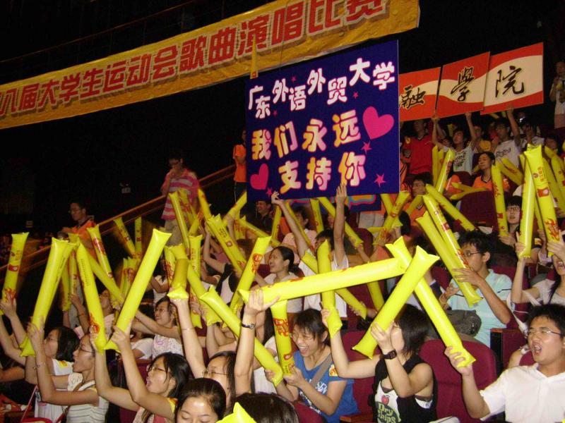 当晚,比赛还没开始,我校的拉拉队员们的热情已经高涨。演艺厅里面不断地回响着队员们的欢呼声和口号声——“广外广外,we can fly”!在拉歌环节中同学们还放声高唱《团结就是力量》,以示对广外代表队的无限支持!热情依然,前奏渐响,广外代表队的四位选手凭着女声高亢、男声浑厚的完美歌声组合和淡定从容的舞台表现赢得了全场热烈的掌声。“广外广外,we can fly!!”的口号又在掌声的包围下回响····