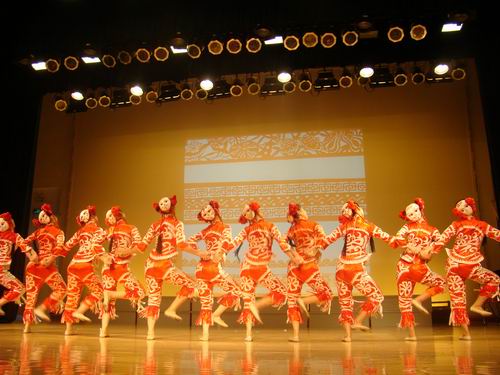 现代的音乐完结后,突然,一抹朱红笼罩了全场。原来,是剪纸姑娘们来了。充满民间民族气息的舞蹈《剪纸姑娘》不仅舞蹈形态曼妙生动,而且舞台视觉效果强烈。投影上的剪纸与她们服装上的图案相辉映,让中华传统的气氛浓浓的郁积在此刻。瞬间,女孩们一转身,戴在头发上的面具展露出另一张可爱的脸,逗得观众忍俊不禁。