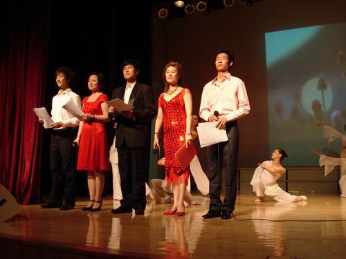 值得一提的是,这次晚会还有师生同台的节目,那就是诗歌朗诵——我的祖国。艺术学院教师宋比多、郑远、米媛以及学生杨超、谭昊携手,带着轻盈曼妙的伴舞,给伟大的祖国带来一首赞歌。