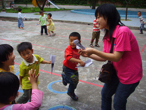 06级艺术设计系的志愿者组织开展的美术教学,同学们们耐心地一步一步地向小朋友们讲解着折纸飞机的步骤,并一步一步的示范给小朋友们看。小朋友们也虚心地跟着我们的小老师学习,整个课堂笼罩在欢快的教学气氛中。