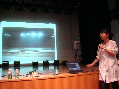 她按照奥运会开幕式的节目顺序,为我们一一介绍了各节目从策划到最后实现的全过程。从欢迎仪式开始,她用幻灯图片结合演讲的方式,为我们展现了一部分曾经提出而最后未被使用的方案。包括3个倒计时方案、梦幻五环方案、夸父追日方案、文字方案、印章方案、诸子百家方案、长城明月方案、大秦古韵方案、五朝盛世方案、同一梦想方案等。她说,这些方案从策划到完成经历了一年多的时间,每一个方案都要严格依据导演的节目编排和要求,配合现实节目表演的需要去设计,但是很多时候都会因为经费、节目更改、上级领导否定或导演否定的各种各样的因素而被否定,最后删除。所以,做设计是一件非常辛苦的事情,同时也是一件为这个社会服务的事情。设计很强调团队的精神。为我们带来了一个多视觉的北京奥运会,让观众看到了影像艺术设计的巨大力量和震撼效果,同时也明白了自己学习路上的困难,激起了学生的钻研和吃苦的奋斗精神。
