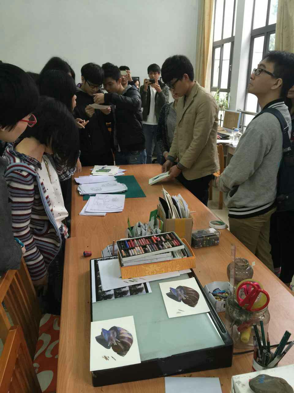 艺术设计系主任汪凌老师带领我系学生与华农师生就专业方向展开全面交流。他们首先观摩了展览作品,在参观设计系动画工作室时,我们介绍了这里实验动画短片的创作经验和工作模式。华农的师生也为我们带来了他们的动画作品并介绍了他们专业工作室的传承经验和淘汰机制。