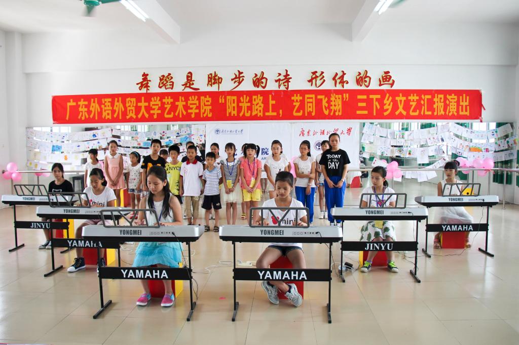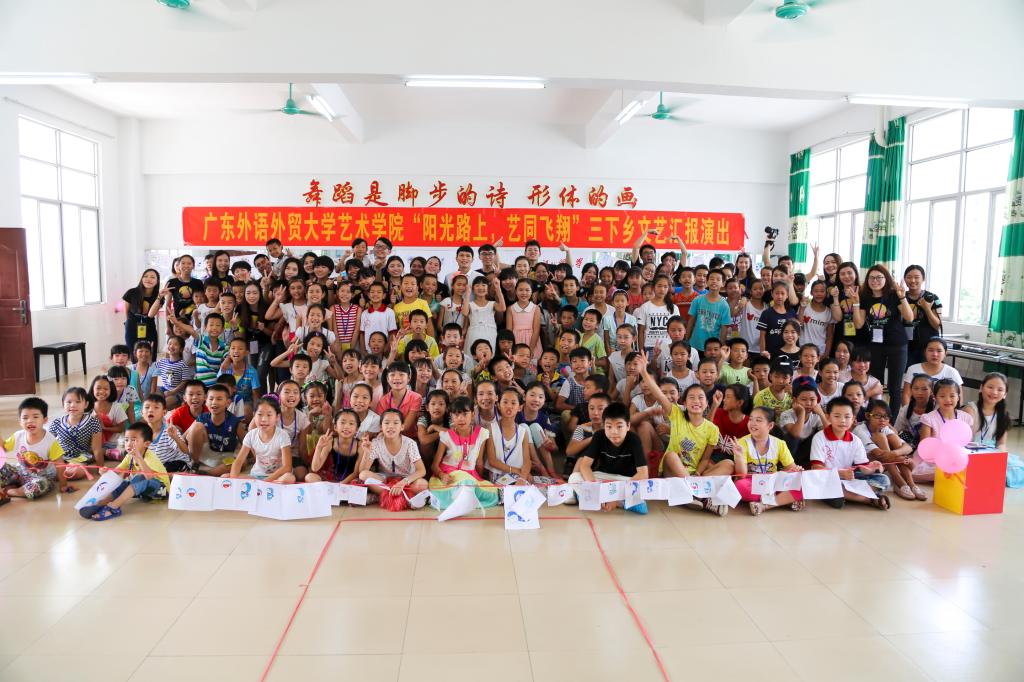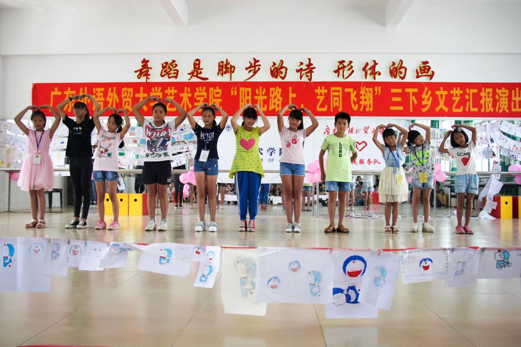 8月1日上午9:00,艺术学院“阳光路上,艺同飞翔”三下乡文艺汇报演出在英红镇中心小学隆重举行。英红镇中心小学副校长林先富、李传星,少先队辅导员张汝梅老师,艺术学院三下乡带队老师杜恩妤以及众多学生家长一起观看了“Sunshine”服务队三下乡活动的成果,演出节目丰富多样,舞台布置别出心裁。