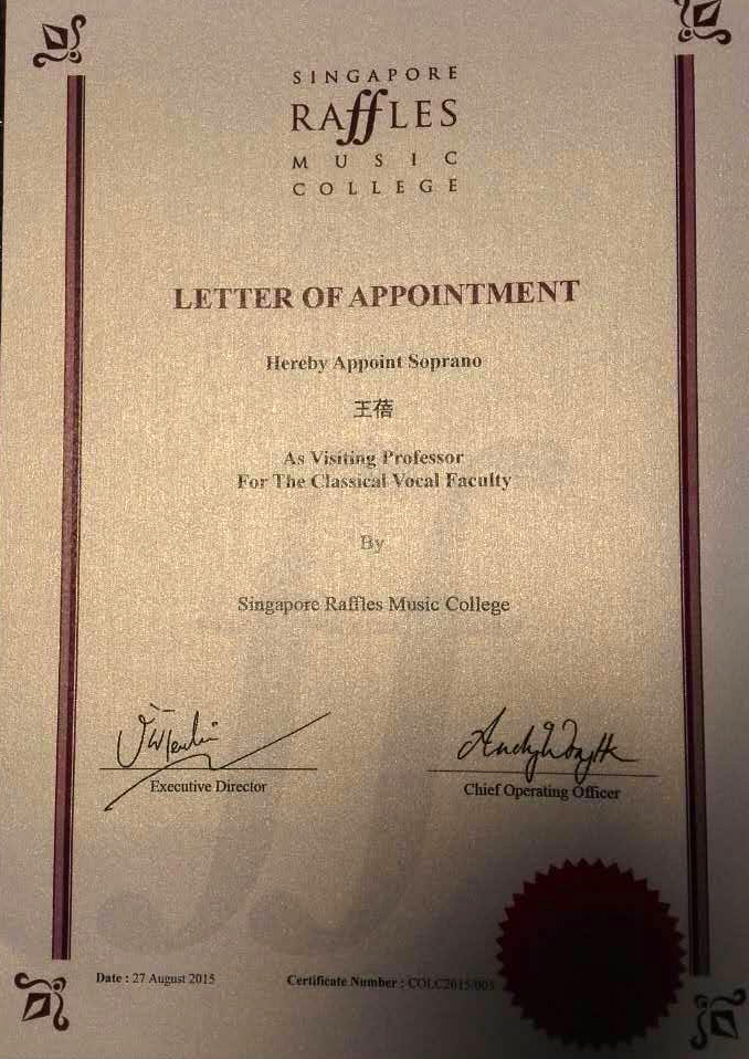 经新加坡国家教育部审核备案,王蓓被聘为新加坡莱佛士音乐学院客座教授,这是我院建院以来第一位走出国门受聘国外专业院校的客座教授,不仅意味着王蓓的专业教学水平得到了国外同行的充分认可,同时也彰显了我院的专业教学实力。