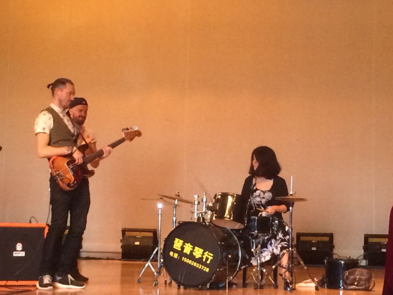 在热烈的呼唤声中,乐队演奏了一首以爱情为主题的曲子,性格开朗的他们积极与场下互动,当乐队贝斯手取下自己的话筒朝向台下的时候,整个场内,低低回绕的是曲子主题旋律,完成一次台上台下的完美合作。此后提问环节中,我院学生请教鼓手相关问题时更是被邀请直接上台表演,在即兴的演出中边合作边指导,显得亲切又自然。