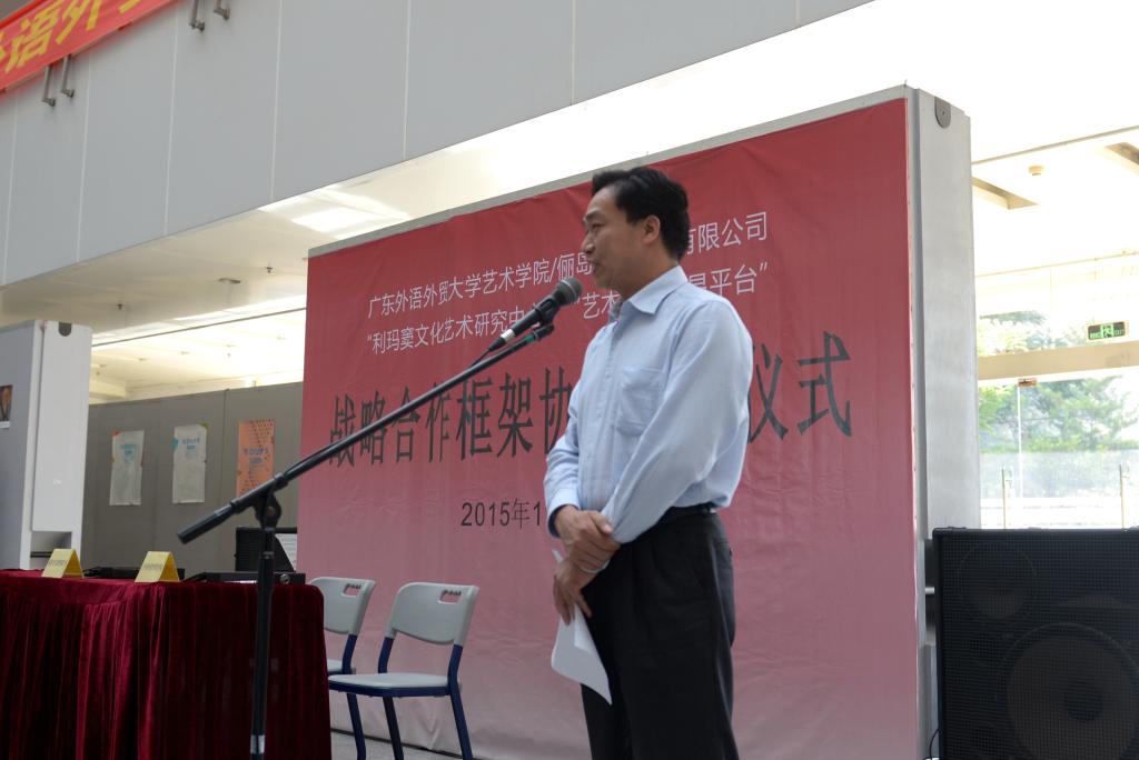 11月2日下午3:00,在学校校庆50周年,艺术学院院庆10周年之际,“利玛窦文化艺术中心”“溯源艺术交易平台”战略合作框架协议签约仪式暨艺术学院文化景观石落成揭幕在我院隆重举行。肇庆市人民政府副秘书长蔡大经、俪岛产业投资有限公司总经理黄长乐、本你网总策划范步遥、肇庆紫云轩端砚工艺雕刻大师程柱开、意大利驻广州使领馆文化专员黄瑞欣,我校副校长方凡泉、后勤处处长扬思、新闻与传播学院院长扬魁、外国文学文化研究中心主任张进、艺术学院院长李于昆、党总支书记朱珍葶等出席,部分师生代表和相关新闻媒体参加。李于昆主持揭幕式。