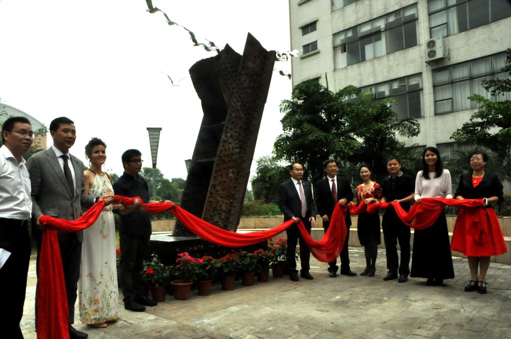 随后,户外现代景观雕塑“飞翔”揭幕式在艺术楼花园广场举行,副院长李志刚主持揭幕式。“飞翔”雕塑由李于昆、罗灵设计,主体为1864年法国埃菲尔铁桥横梁拆卸构件,顶端嵌有十只展翅飞翔、晶莹剔透的和平鸽,寓意学院十年历程,y字型的造型寓意“艺术摇篮”,艺术学子将从这里扶摇直上,在艺术的天空展翅翱翔。正如朱珍葶所言:这座雕塑的诞生,不仅仅是见证了中法友谊,更是广外首次引入国际公共空间艺术观念,广外的人文景观也因此增添了国际化的元素和氛围。
