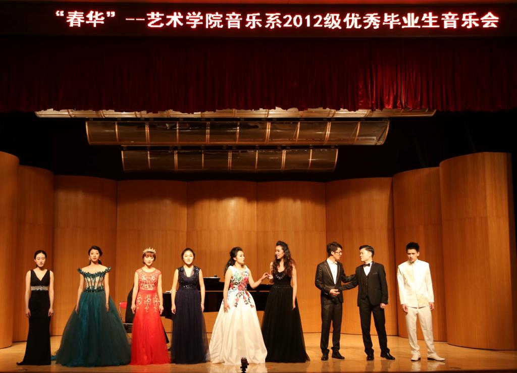 为了展现我院音乐系学生的风采和教学成果,5月9日晚7:30,由艺术学院主办的“春华”----2012级音乐系优秀毕业生音乐会在艺术学院小剧场举行,这是建院以来音乐表演专业第八场优秀毕业生音乐会。广东外语外贸大学副校长方凡泉,党委组织部、统战部部长方迎生、教务处处长袁长青,艺术学院党总支书记朱珍葶、副院长罗金燕、副书记张莉、各系主任以及学校外教、师生参加了音乐会。