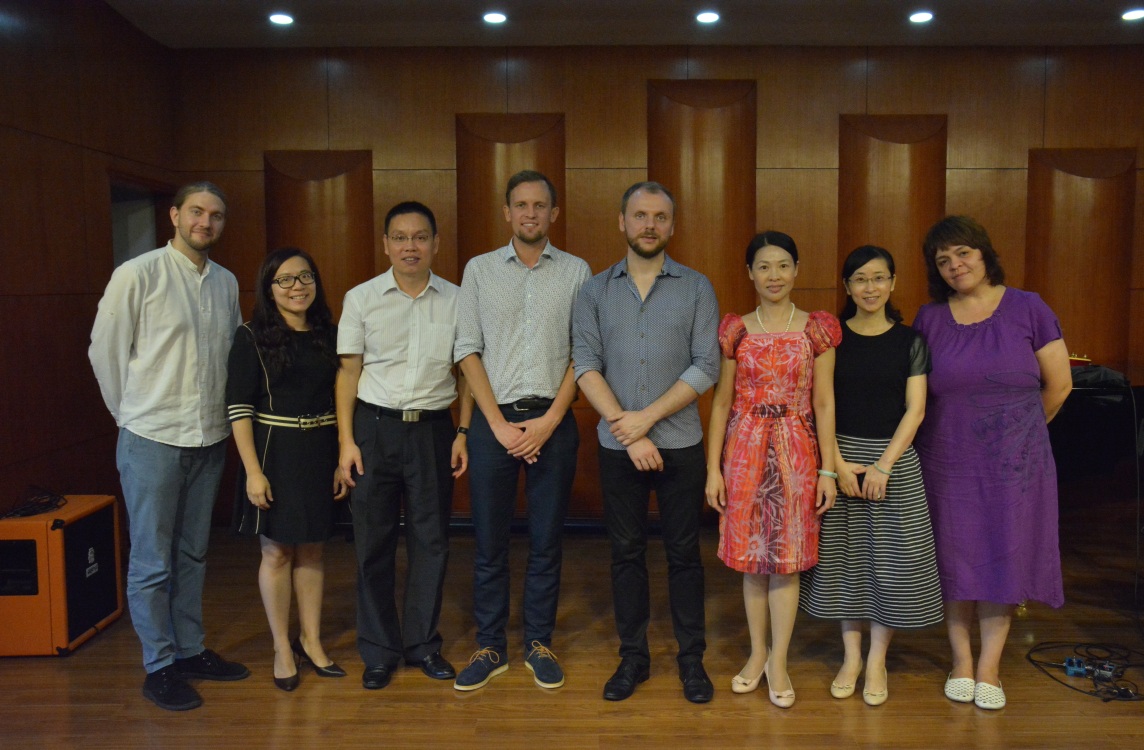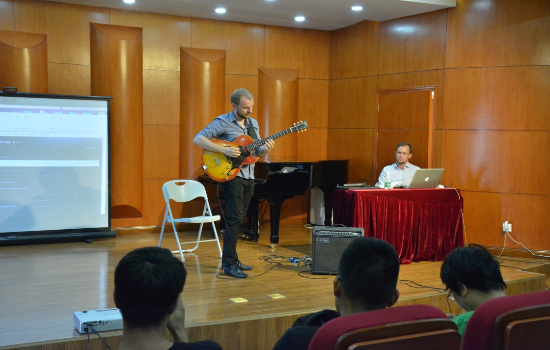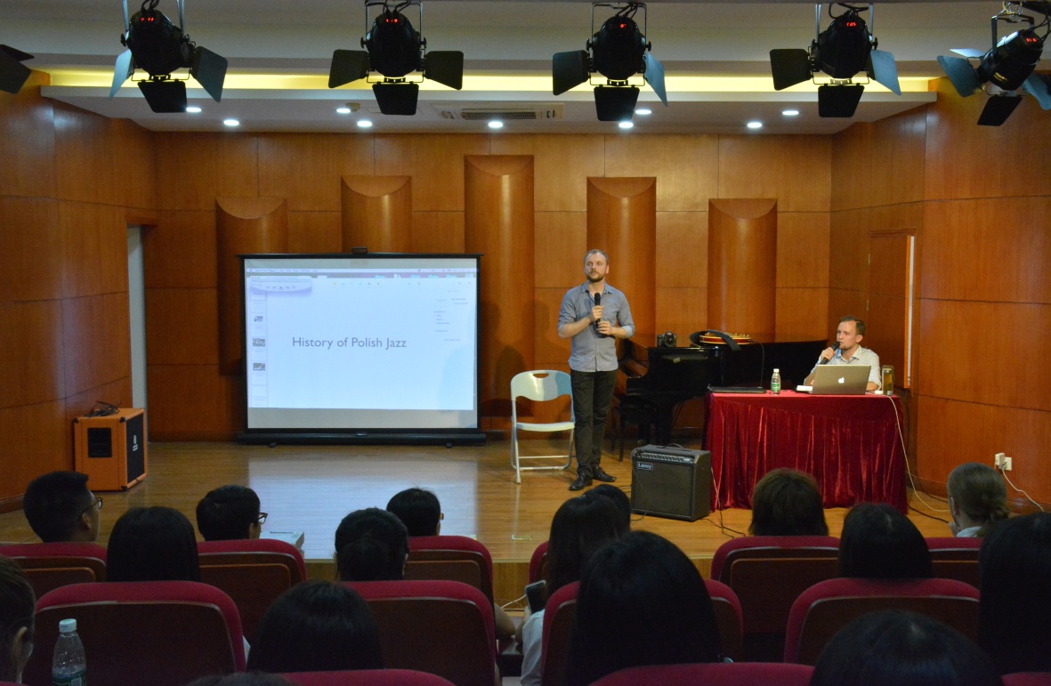 交流伊始,为了加深学子们对波兰爵士乐的了解,Rafal Sarnecki精心讲解了波兰爵士乐的发展史。讲座期间还亲自示范了著名好莱坞电影《Rosemary Baby》中由波兰电影配乐大师Krzysztof Komeda所作的配乐,令在场的老师、学生们都大饱耳福。