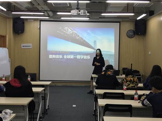 酷狗音乐总裁助理江明秦首先代表公司对我院师生的到来表示欢迎,并讲解了酷狗音乐的发展历史、直播空间、音乐现场、以及线上线下平台构成等,希望在公司和学院大创中心已签订的框架合作协议基础上,以艺术学院为中心,辐射到学校乃至广州大学城各所高校,把全新的“众创空间”打造成一个服务于大学城学生的造星“梦工厂”。随后的学生提问环节中,现场气氛热烈。