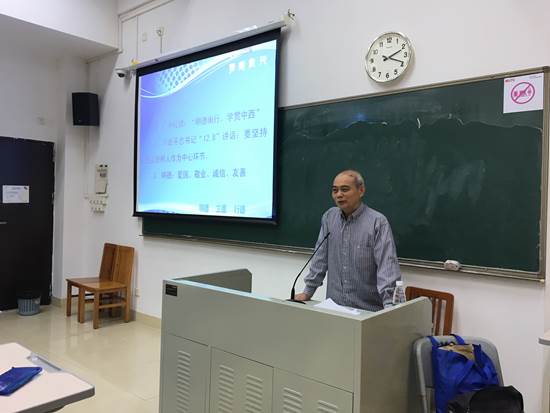 4月14日下午,我校关工委主任冯益谦教授应邀于南校区艺术楼344教室为艺术学院师生讲“‘明德尚行’再思考——重读校训有感”,给在场座无虚席的60余名师生上了一堂深刻生动的思政课。学院党总支副书记张莉,副院长李志刚、团委书记邓煜出席,学生党支部成员以及各年级学生干部积极互动,气氛热烈。
