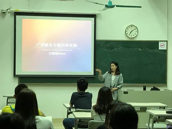张莉主持分享会,她首先欢迎新东方集团与我院合作给同学们带来宝贵的经验分享机会。随后,通过了英语专业八级、获得了英国剑桥教学资格证书认证的王晓茹讲师为大家分析了四六级考试最新的变化。王晓茹重点从占分最多的阅读部分讲解,详细为大家介绍了A、B、C三种阅读题型的答题技巧。她强调实践出真知,并讲述如何将真题的作用发挥到极致。