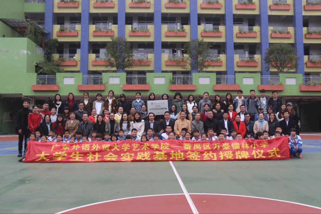 11月24日上午,广东外语外贸大学艺术学院-广州市番禺区万豪儒林小学大学生社会实践基地揭牌暨签约仪式在万豪儒林小学顺利举行。番禺区南村镇教育指导中心主任区炽煊、广东万威达(教育)集团董事长胡春万、广东万威达(教育)集团部长涂泽寰、我院党总支副书记张莉、我院副院长李志刚、院长助理涂颖、艺术管理与舞蹈系主任马威威、辅导员谭珺如以及学生代表参加了此次仪式。
